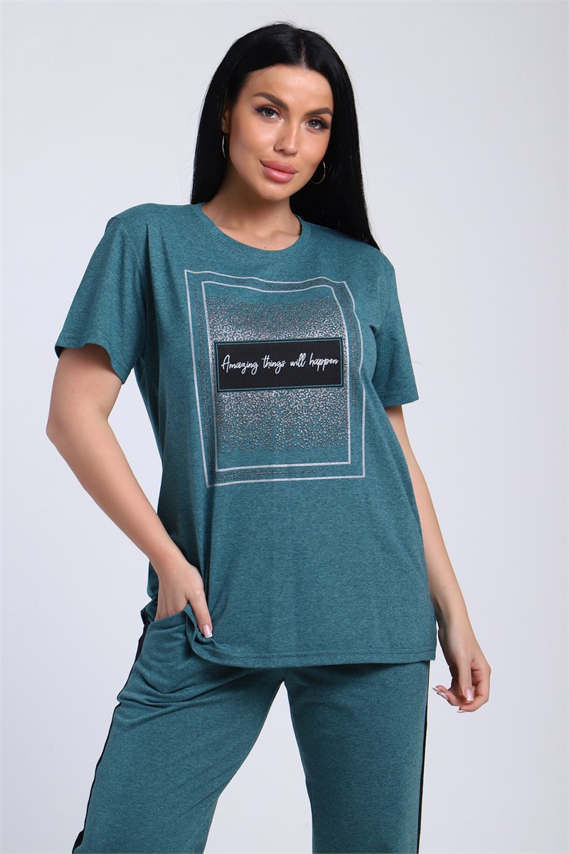 Классический и удобный трикотажный костюм с брюками из легкой хлопковой ткани! В комплекте костюма представлены кофта свободного кроя и брюки универсальной посадки с лампасами по бокам. Кофта украшена лаконичным принтом. Костюм - идеальный вариант домашней одежды для женщин, также прекрасно подойдет и для повседневной носки.
