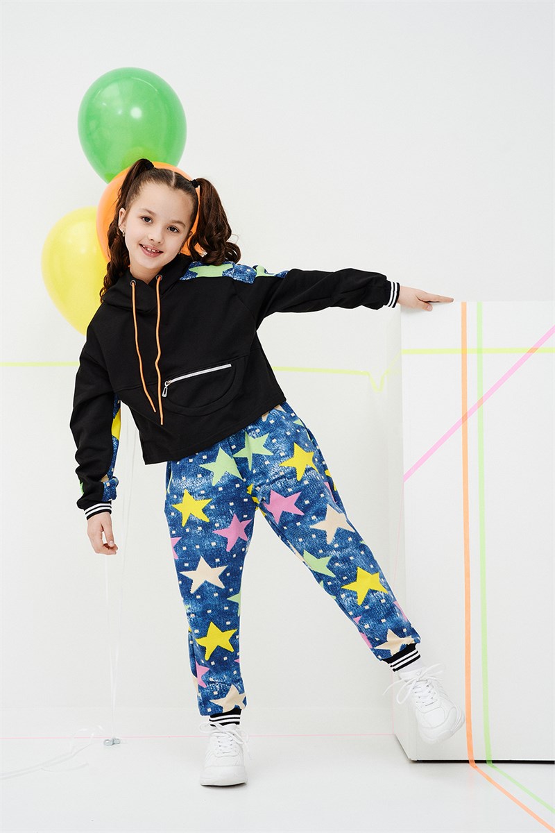 Костюм детский свободного силуэта состоит из толстовки и брюк (шароваров). Толстовка с капюшоном с ярким шнурком. Полочка оформлена функциональным карманом под гаджет, Низ рукавов обработан эластичной рибаной. Брюки широкие в форме (шаровар) с ярким декором в виде звезды, с кармашками в боковых швах и эластичной резинкой с ярким шнурком в поясе, низ брюк обработан эластичными манжетами из рибаны.