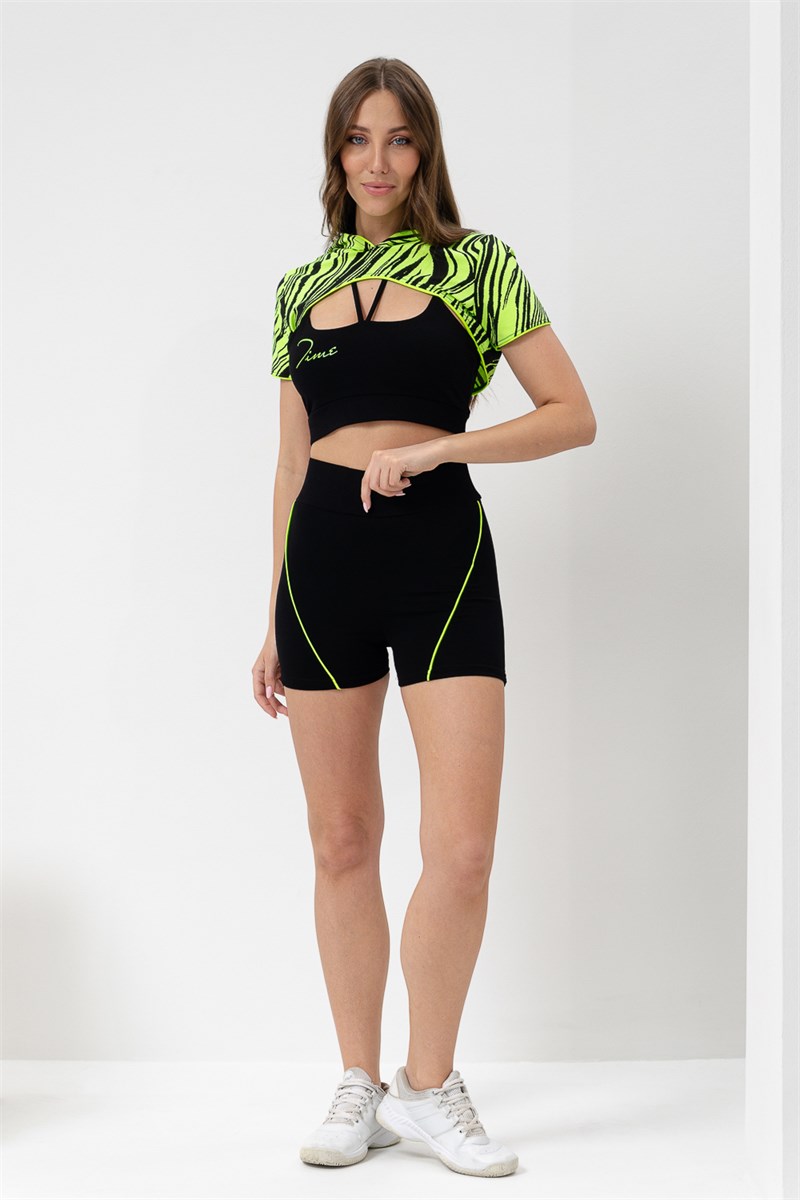 Костюм женский спортивный - тройка, состоит из худи с капюшоном, укороченного топа на тонких бретелях и шорт с широкой эластичной резинкой в поясе.