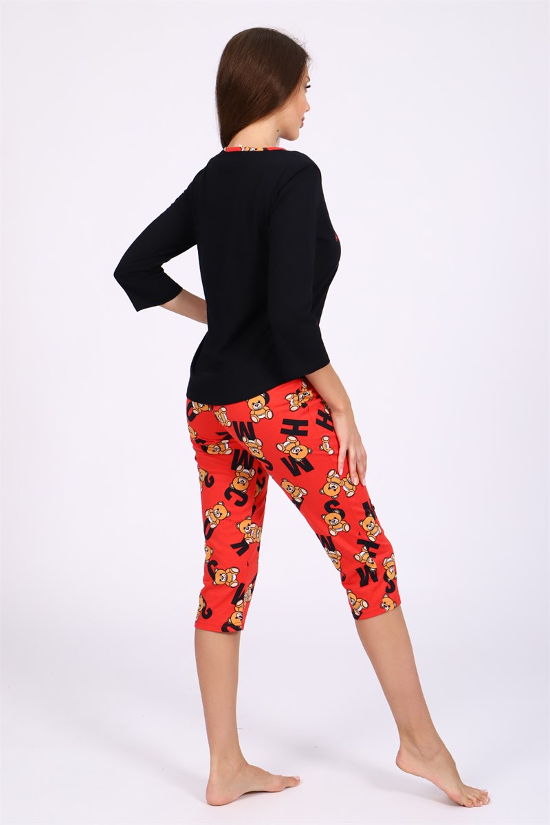 Женский молодежный костюм-пижама, состоящий из футболки с удлиненным втачным рукавом, округлой горловиной, отделанной обтачкой из ткани бридж и закругленным низом и бридж на резинке на талии шириной в 3 см. На груди печать в виде маленького медвежонка и надписи, на бриджах - принт по ткани также в виде медвежат. Пижама сшита из трикотажного полотна, 100% хлопок (кулирка). Удобная, мягкая, приятная к телу, не стесняет движения. Яркие, стойкие цвета ткани соответствуют модным тенденциям. Пижама - незаменимый предмет гардероба каждой женщины. Прекрасно подходит для сна и отдыха, а также для ношения, как домашний костюм, для пижамных вечеринок. Отличный подарок для девочек, юных девушек и женщин.