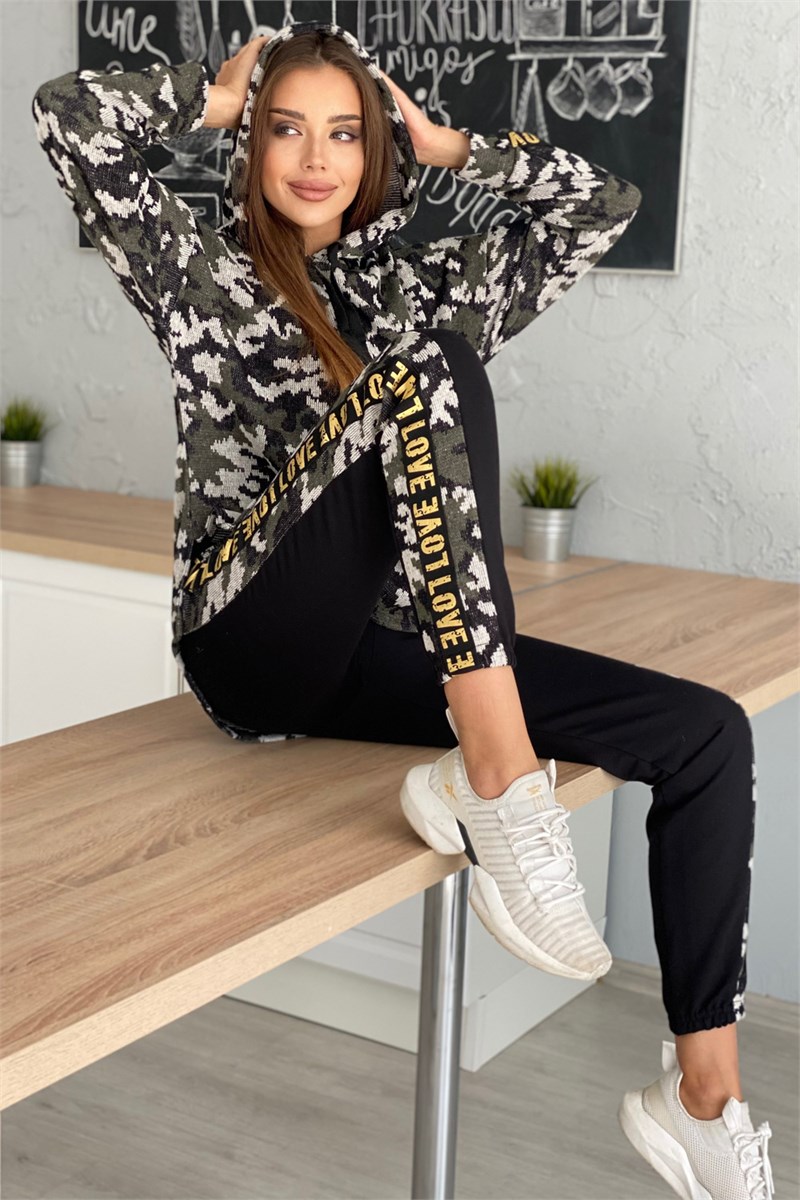 Костюм состоит из толстовки и брюк. Брюки на поясе, с боковыми карманами, с лампасами из отделочного полотна по боковым швам, на резинке по низу. Толстовка прямая, свободная, с капюшоном, с длинным рукавом на манжете. Низ спинки фигурный. В нижней части боковых швов обработаны разрезы.
