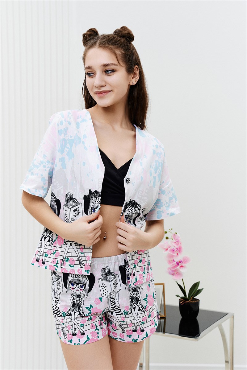 Комплект состоит из топа, шорт и короткой рубашки. Топ из эластичного полотна, на тонких бретелях, длиной выше линии талии. Горловина и бретели топа обработаны бейкой из основного полотна. Рубашка выполнена из отделочного полотна из кулирки, полуприлегающего силуэта, длиной ниже талии, с коротким рукавом, с застежкой на одну пуговицу. Горловина обработана обтачкой. Шорты широкие, на резинке.