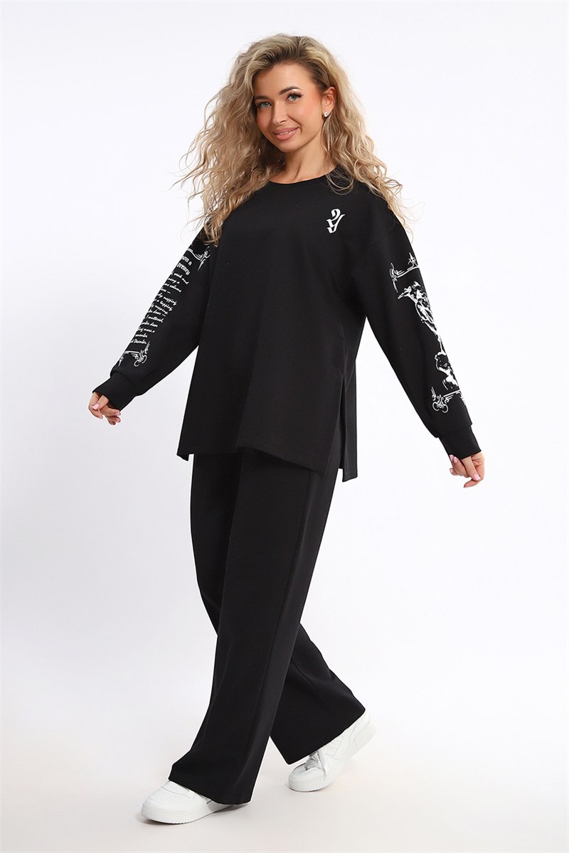 Молодежный костюм состоит из кофты и брюк. Кофта свободная, по боковым швам разрез. Рукав длинный со складочками на манжете. Оригинальная печать на спинке, полочке и рукавах. Брюки свободные с карманом, прямого кроя. Пояс брюк обработан на поясной машине. Костюм отлично подойдет как для повседневной носки, так и для спорта и прогулки. В нашем модном костюме вы будете самой красивой!