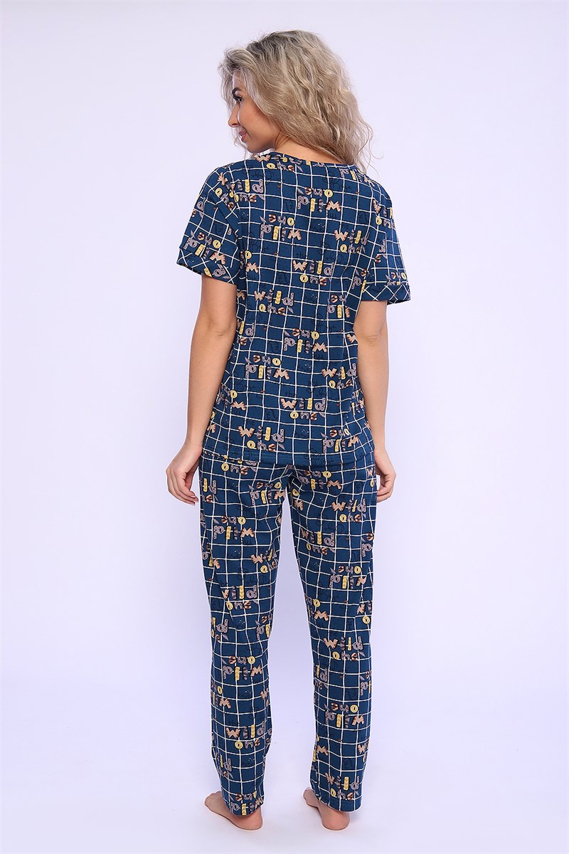 Костюм состоит из брюк и футболки. Брюки с карманами. Футболка с короткими рукавами на манжетах. Полочка с отрезными кокетками, скроенными по косой и V - образным вырезом горловины.