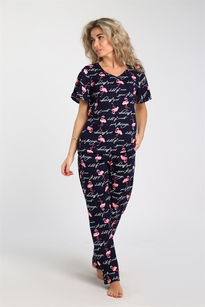 Домашний костюм состоит из футболки и брюк. Брюки с карманами. Футболка с короткими рукавами - крылышками. Комфортен для повседневной носки и сна.
