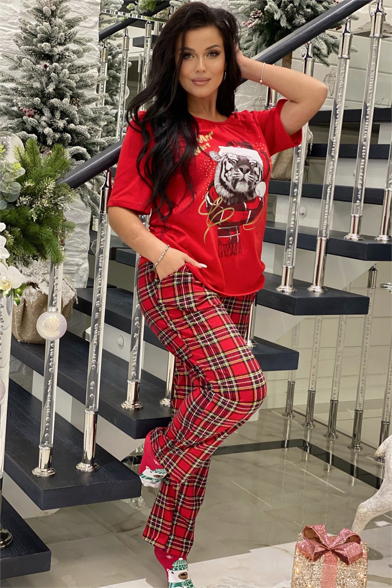 Костюм женский домашний: футболка с брюками. Футболка прямого силуэта с втачным коротким рукавом. На полочке новогодний принт. Брюки полуприлегающего силуэта с внутренними карманами на передних половинках брюк.