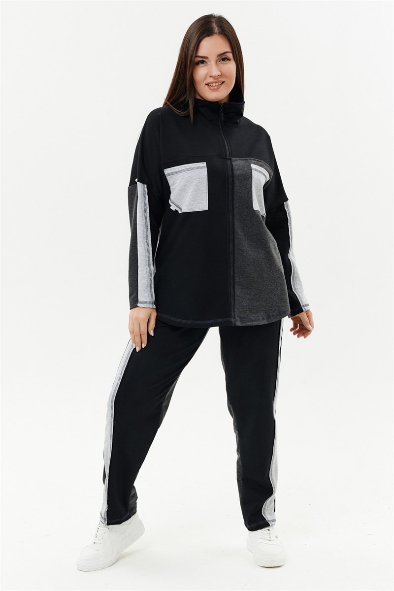 Костюм женский: толстовка и брюки. Толстовка прямого силуэта, брюки свободные по бедрам, зауженные к низу. Рукав цельнокроенный со швом. Воротник-стойка застегивается на тесьму-молнию. Карман кенгуру. В костюме удачно сочетается однотонный футер с меланжированным. На спинке и полочке кокетки. Нагрудные карманы, лампасы на рукавах и брюках из контрастной отделочной ткани. На передних половинках брюк внутренние карманы.