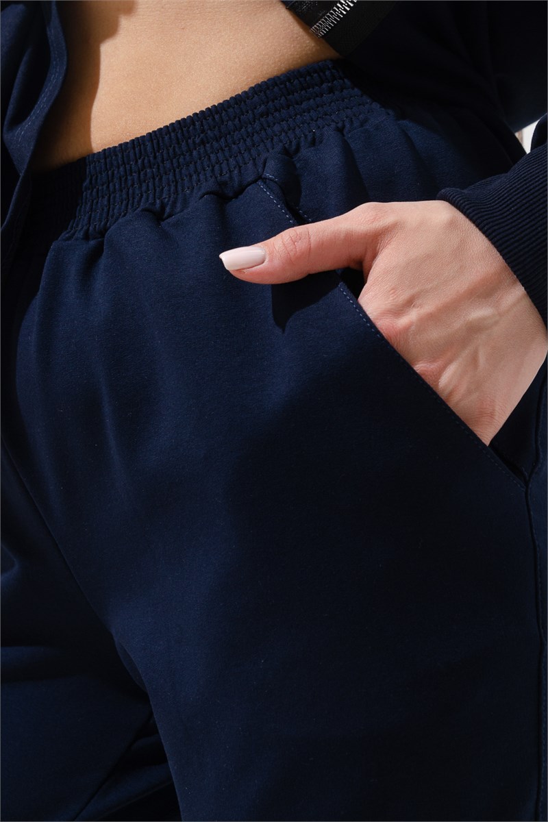 Костюм женский: толстовка и брюки. Брюки женские, свободные по бедрам, зауженные к низу. На передних частях брюк внутренние карманы. На задних частях брюк фигурные рельефы, переходящие в боковой шов. Толстовка прямого силуэта с капюшоном. Рукав спущенный. Низ толстовки фигурный, сбоку стильные молнии, при расстегивании образуют разрезы. На рукавах модный принт.