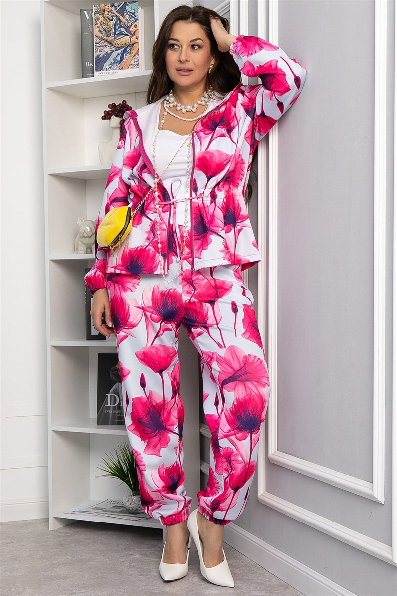 Спортивный костюм с ярким принтом — это эффектный выбор для модных и энергичных женщин! Он прекрасно подойдёт как для повседневной носки в городе и дома, так и для занятий спортом. Костюм-двойка состоит из брюк свободного кроя на резинке по талии и снизу, что обеспечивает максимальный комфорт. Кофта на молнии с капюшоном и завязками на талии с люверсами добавляет стильный акцент. Этот комплект сочетает в себе удобство и стиль!