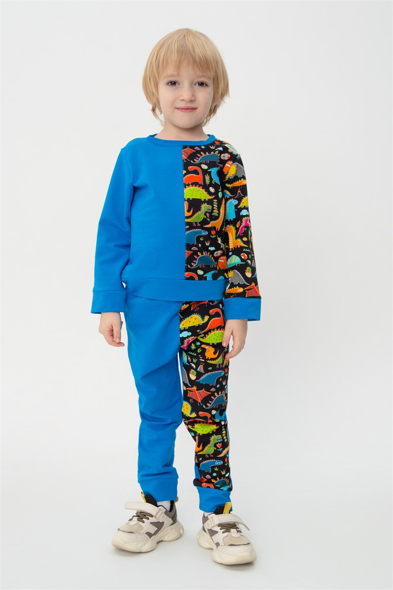 Костюм Дино состоит из свитшота с принтом и брюк. Изделия выполнены из набивного футера, что поможет ребенку не бояться прохладной погоды. Комплект слегка прилегает к телу, не раздражает кожу и легок в уходе. При стирке не деформируется и не пилингуется.