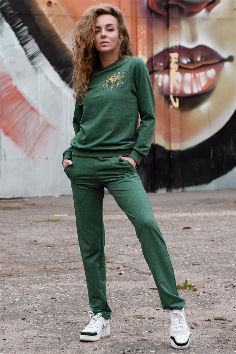 Современный молодёжный костюм, состоящий из свитшота и брюк, зауженных к низу. Брюки на кокетке с боковыми внутренними карманами. Манжеты, горловина, пояс на свитшоте изготовлены из качественной ткани-кашкорсе, которая не растягивается после стирки. Тёмный цвет костюма визуально стройнит.