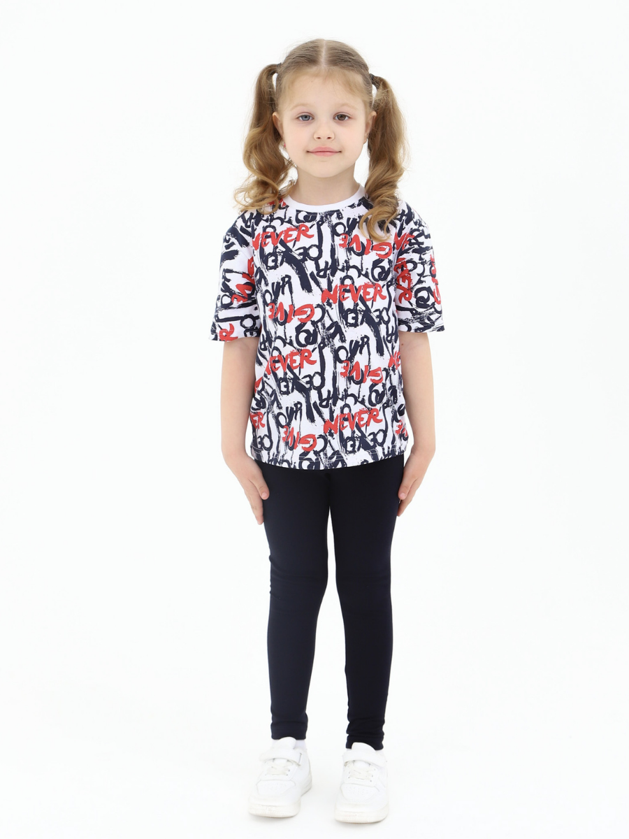 Костюм состоит из легинс с эластичным поясом и футболки. Футболка выполнена из высококачественного хлопка, что гарантирует комфорт и удобство в носке. Лосины выполнены из кулирки с лайкрой эластичного трикотажного полотна, которое не стесняет движения.