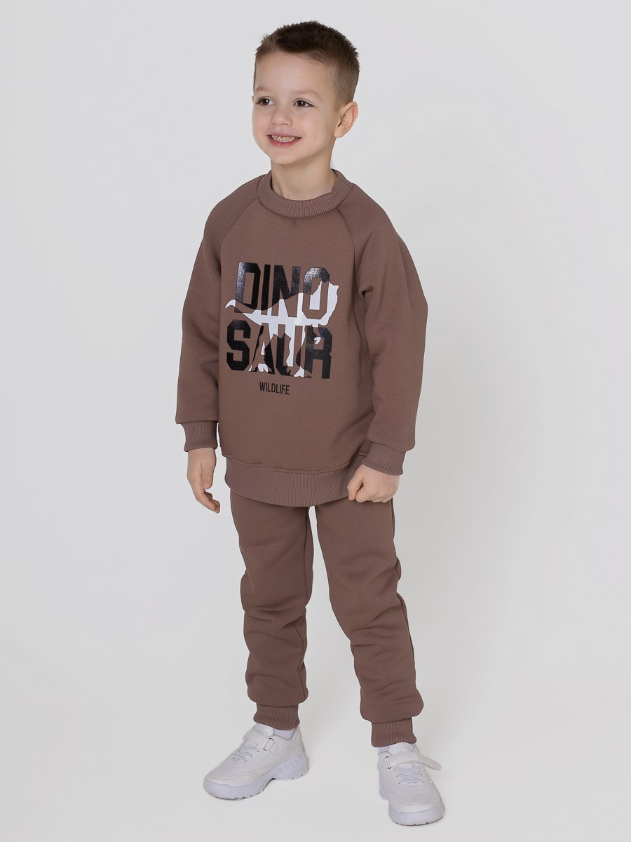 Костюм для мальчика предназначен для носки в прохладных помещениях и прогулки на улице, выполнен из мягкого футера с начёсом. Толстовка на поясе, рукава покроя реглан на манжетах. Штанишки с карманами в боковых швах, на манжетах, пояс на резинке.Принт на толстовке, нанесённый методом шелкографии.