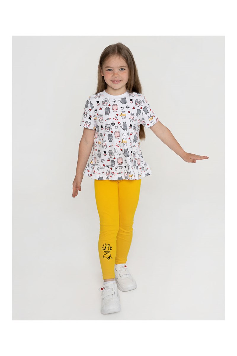 Костюм Тиа для девочек, состоящий из футболки и лосин, предназначен для летней прогулки. Отличный вариант на каждый день.Лосины оформлены принтом-шелкография на ткани. Округлый ворот футболки, низ футболки с баской, которая придаёт нежность и лёгкость. Лосины на резинке.