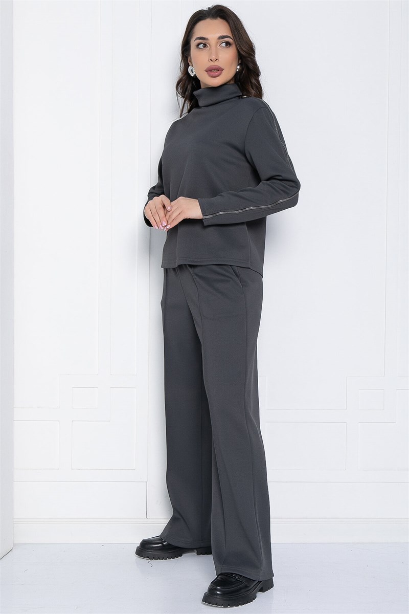 Повседневный костюм — это сочетание удобного верха и свободных брюк. Свободный крой делает его идеальным для активного отдыха и занятий спортом. Верх костюма выполнен с широким воротником и функциональной молнией на правом рукаве, что придает ему особый акцент. Брюки также свободного кроя, с карманами и поясом на резинке, что обеспечивает комфорт в любой ситуации.