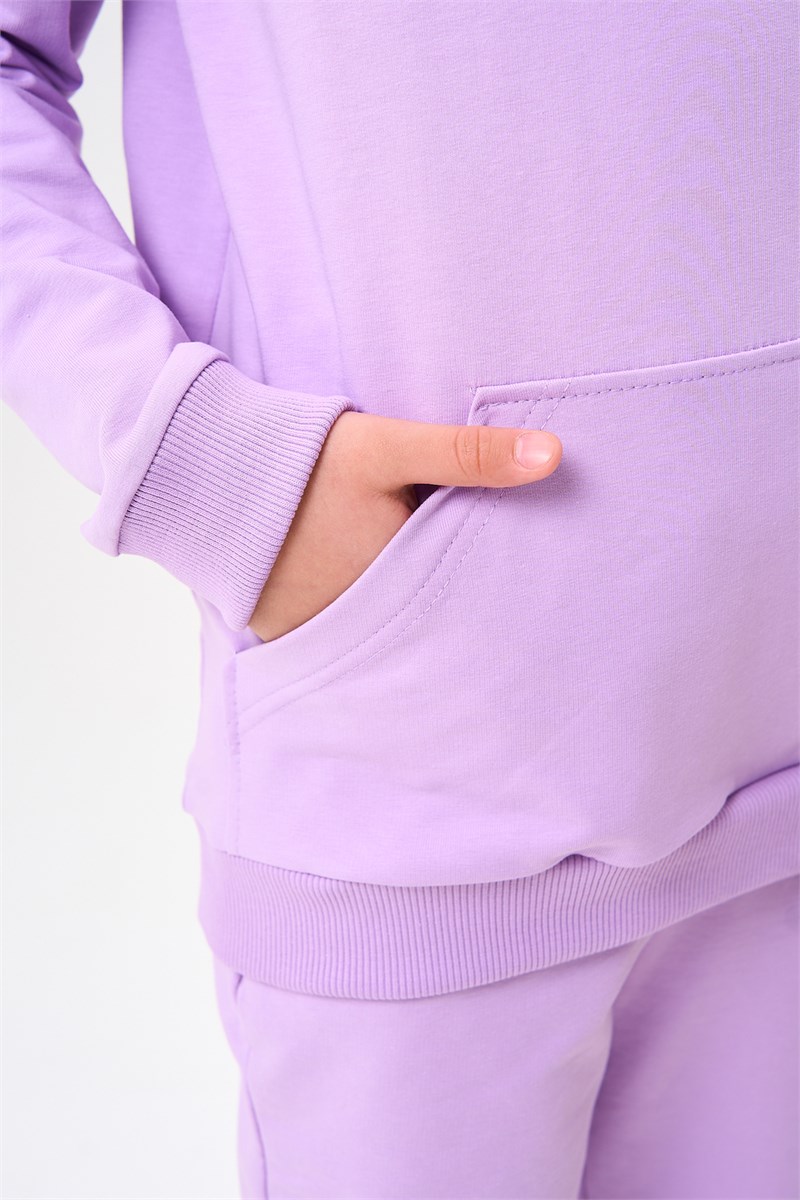 Костюм для девочек дошкольного и младшего школьного возраста. Костюм состоит из толстовки и штанов. Костюм из трикотажного эластичного хлопкового однотонного полотна футер . Толстовка с капюшоном, с длинным рукавом на манжете и поясе из основного полотна. На переде толстовки расположен карман-кенгуру. Штаны с боковыми карманами, на манжетах и поясе из основного полотна.