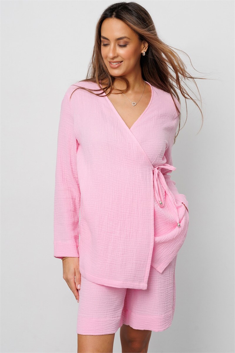 Представляем Вам стильный летний костюм двойка от Raposa, созданный для тех, кто ценит качество и элегантность. Этот муслиновый наряд станет вашим любимцем в жаркие дни! Он сшит из 100% хлопок, что делает его невероятно мягким, дышащим и приятным к телу. Пижамный костюм состоит из рубашки на запах с длинными рукавами и шортами бриджами, которые обеспечивают свободу движений и комфорт в любое время суток. Благодаря высокой посадке и свободному крою, этот костюм из муслина подойдет для полных женщин плюс сайз больших размеров до 54 и 56 и для беременных. Пляжный костюм можно носить как дома, так и на прогулке или наряд на фотосессию, на пижамную вечеринку. Однотонный дизайн в нежном розовом цвете, позволяет легко комбинировать костюм женский с другими вещами, создавая разнообразные образы. Кофта на завязках позволяет регулировать посадку по фигуре, а прорезные карманы на бермудах добавляют практичности. Этот костюм с шортами - идеальный выбор для тех, кто ищет удобную, красивую и универсальную одежду на лето и весну 2025. Костюм кимоно станет прекрасным подарком девушке, для девочки подростка. Легкий и воздушный хлопковый костюм подарит Вам ощущение прохлады даже в самую жаркую погоду. Его можно носить как пижаму или как стильный домашний костюм. А благодаря своей универсальности и модели оверсайз, костюм с широкими штанами прекрасно подойдет для отдыха на природе, прогулок по городу или просто для времяпрепровождения дома.