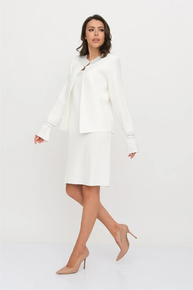 Очень нарядный трикотажный костюм, состоящий из жакета и платья. Жакет с круглой горловиной застегивается на декоративный крючок. Платье длиной 100см с коротким рукавом, жакет 58см. По горловине жакета и платья проходит декоративная полоса с люрексом. Манжет жакета связан элегантным фонариком.