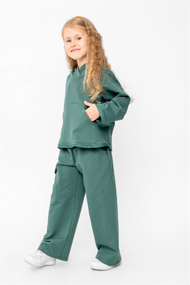 Костюм из мягкого футера двунитки двойного крашения качества пенье. Свободный крой, худи с капюшоном и накладным карманом, брюки прямые с боковыми карманами и одним накладным.