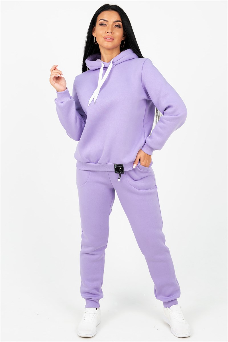 Костюм состоит из толстовки с капюшоном и брюк, выполненных их плотного хлопкового трикотажа - футер 3х-нитка с начесом. Капюшон фиксируется шнуром. Пояс и манжет рукава толстовки выполнен из кашкорсе. Низ декорирован шевроном. Брюки с высокой посадкой, на резинке, с боковыми карманами, манжеты из кашкорсе. Отличный вариант для домашнего гардероба, спортивного, повседневного образа. Такая модель особенно удобна и комфортна в прохладное время года. Футер 3-х нитка с начесом очень приятен и мягок на ощупь.