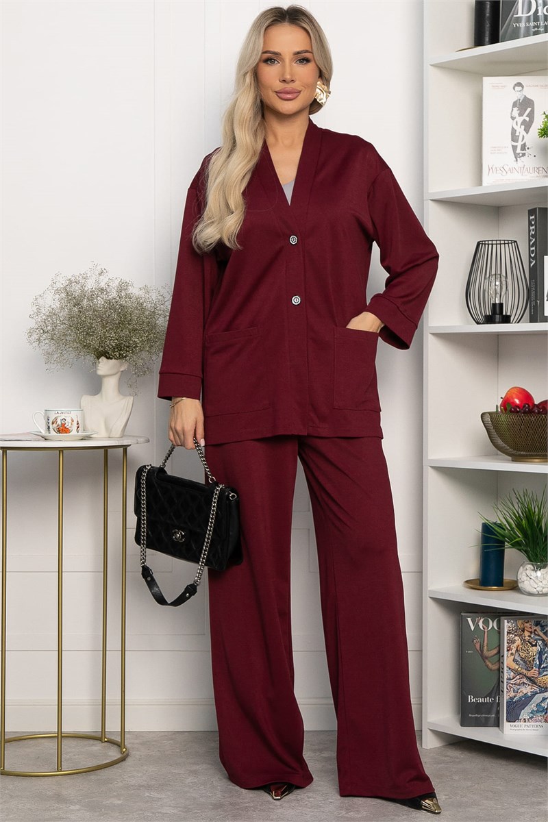 Женский брючный костюм в бордовом цвете — это превосходный выбор для тех, кто стремится выглядеть элегантно и при этом оставаться в комфорте в любую погоду. Жакет с пуговицами и слегка приспущенными рукавами обеспечивает полную свободу движений, позволяя вам чувствовать себя уверенно и свободно. Брюки-палаццо с резинкой по талии и карманами добавляют практичности и удобства, что делает этот костюм поистине универсальным и подходящим для различных ситуаций.