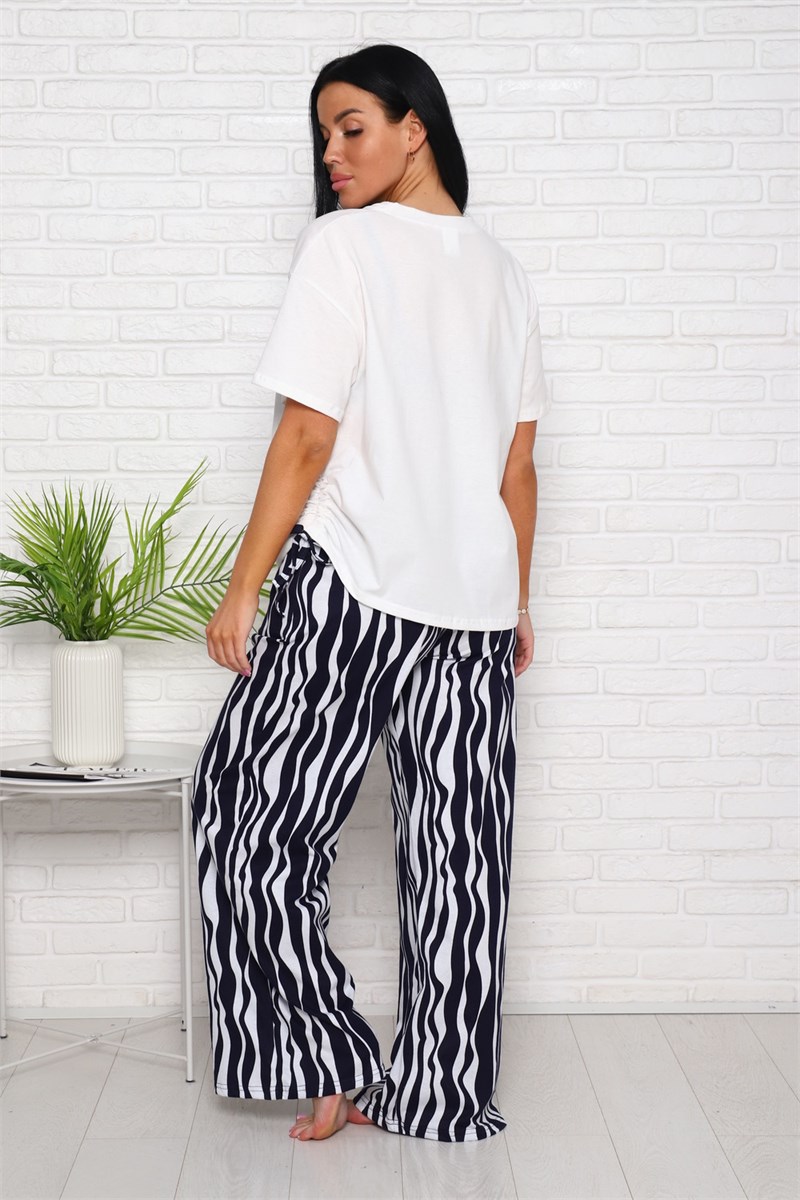 Женский костюм выполнен из трикотажного полотна кулирка. Костюм состоит из футболки и брюк. Футболка свободного силуэта по горловине выполнена обтачка, на полочке пресутсвуют печать, сбоку кулиска. Брюки расклёшенного силуэта по бокам карманы.