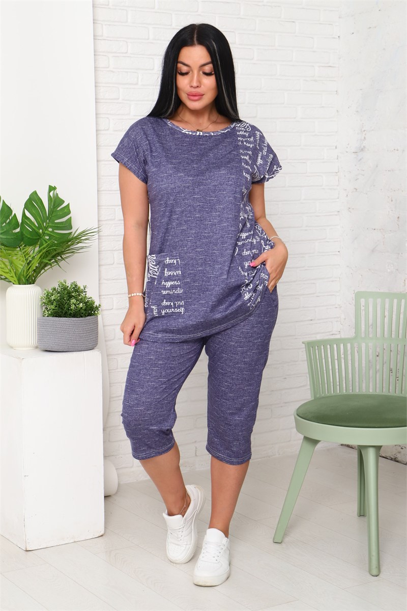 Костюм женский футболка и бриджи. Футболка со спущенным плечом и накладным карманом, низ футболки фигурный. Бриджи с карманами.