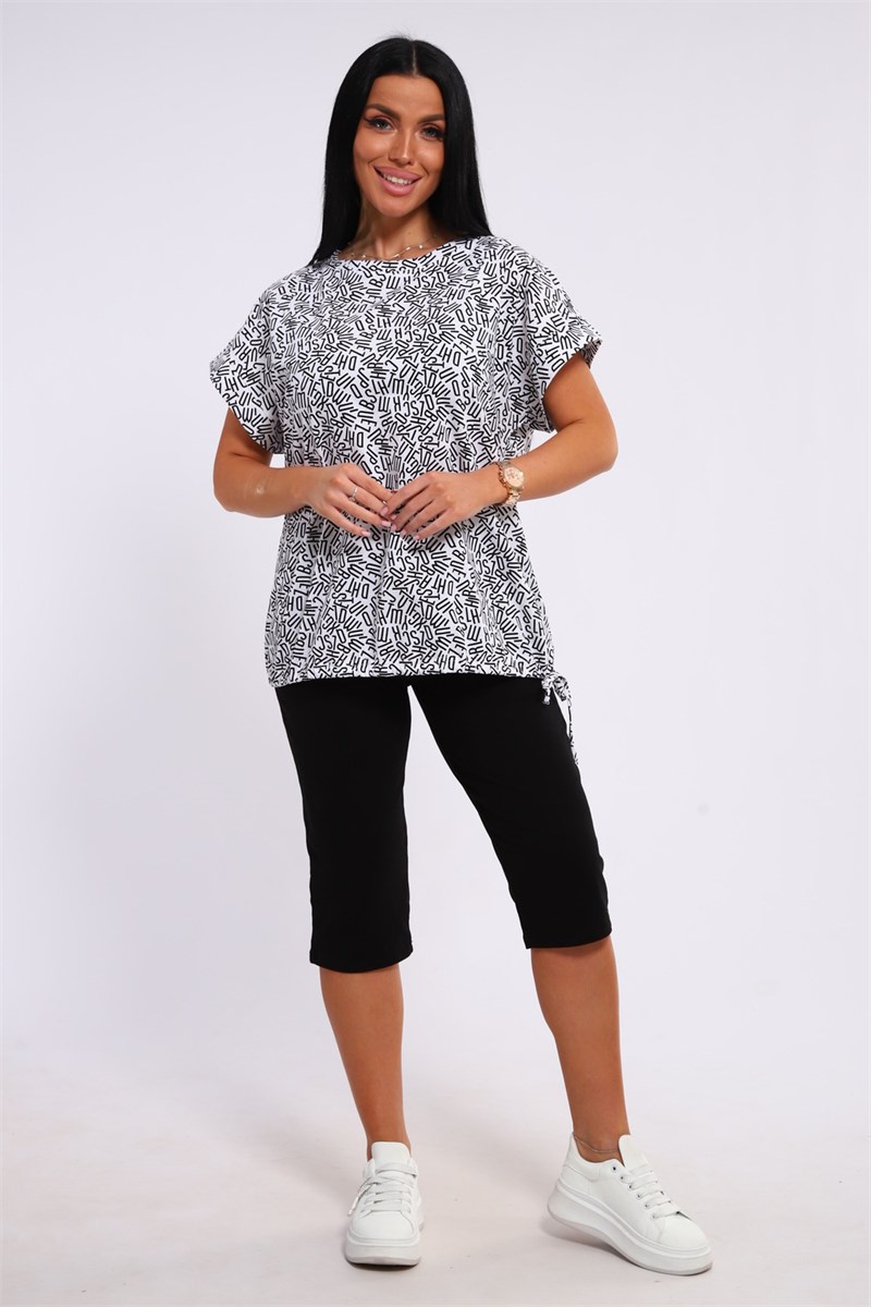 Костюм женский футболка и бриджи. Футболка свободного кроя, плечо спущенное на манжете, низ на завязках. Бриджи без карманов.