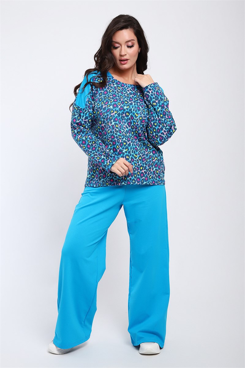 Трикотажный женский костюм предназначен для девушек, ценящих комфорт, удобство и спортивный стиль. Он имеет свободный крой, который подходит для тех, кто предпочитает свободные вещи. Джемпер со спущенным рукавом. Штаны клеш в стиле палаццо с карманами имеют завышенную посадку и визуально вытягивают фигуру, что особенно актуально для невысоких и полных девушек. Модель подчеркивает фигуру и скрывает все недостатки. Подойдет для прогулок в кино с друзьями, путешествий, работы в офисе, праздника, а также как вечерний модный образ на свидание.