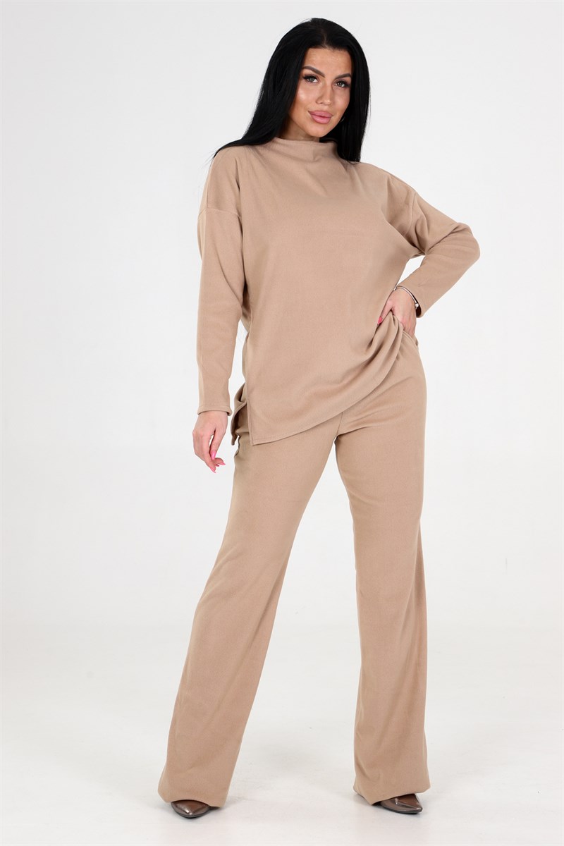 Костюм женский двойка состоит из туники свободного кроя и брюк на резинке. Туника имеет стойку на горловине и рукава длиной до запястья, обеспечивая теплую защиту для вашего верхнего тела. А брюки в стиле палаццо добавляют дополнительный комфорт и свободу движений.