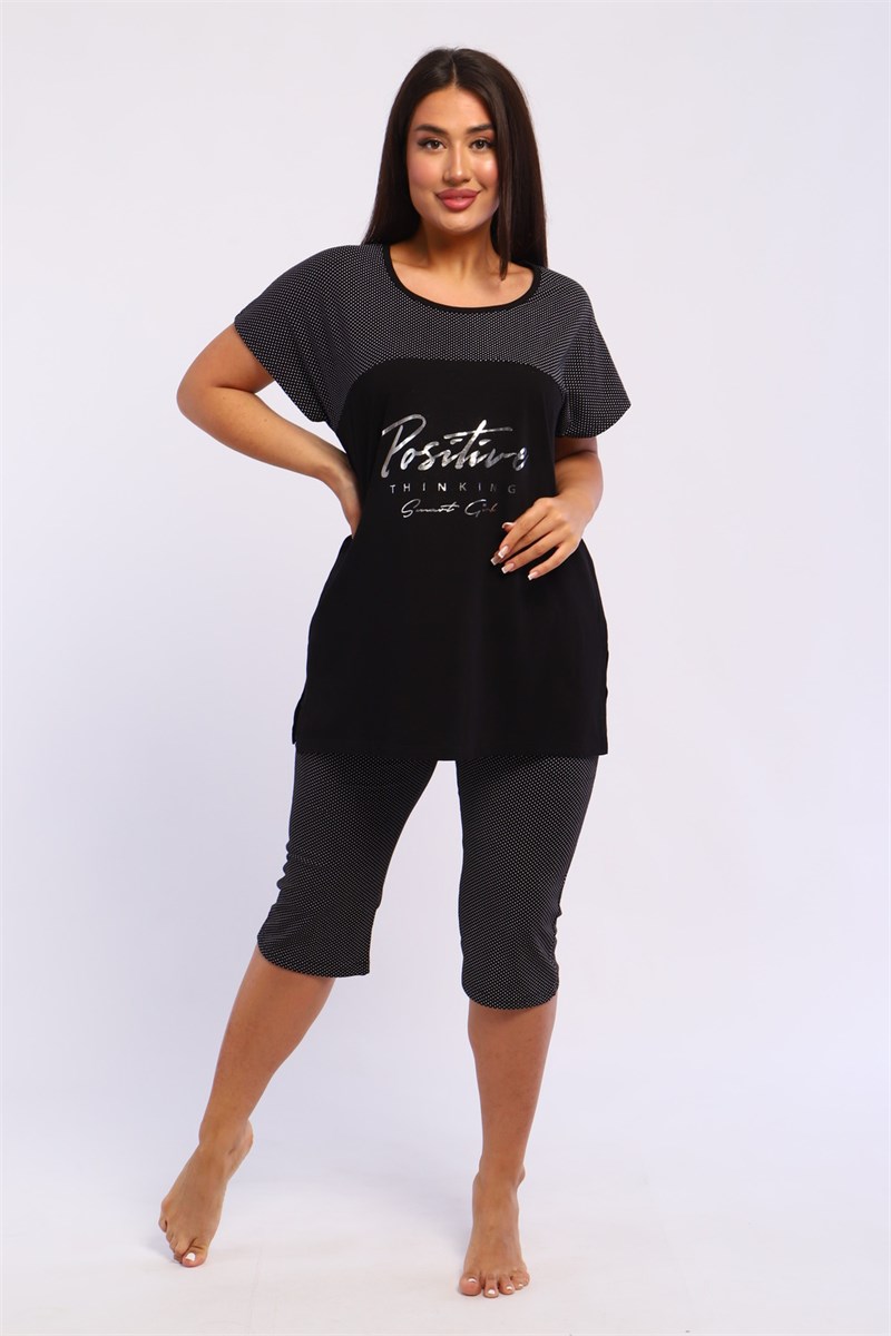 Костюм включает в себя стильную футболку и бриджи, выполненные из высококачественного материала, который гарантирует отличную воздухопроницаемость и приятные тактильные ощущения. Будьте уверены, что в этом комплекте вам будет удобно и тепло в любое время года. Он отлично сидит на фигуре и подчеркивает её достоинства, что особенно актуально для подходящей одежды больших размеров. Пижама с бриджами обеспечивает свободу движений, позволяя вам заниматься йогой, фитнесом или просто расслабляться на диване. Спортивный стиль костюма в сочетании с модными элементами поможет вам выглядеть стильно и современно даже в домашней обстановке. Футболка имеет удобный крой и не стесняет движений, что делает её отличным выбором для активного отдыха.