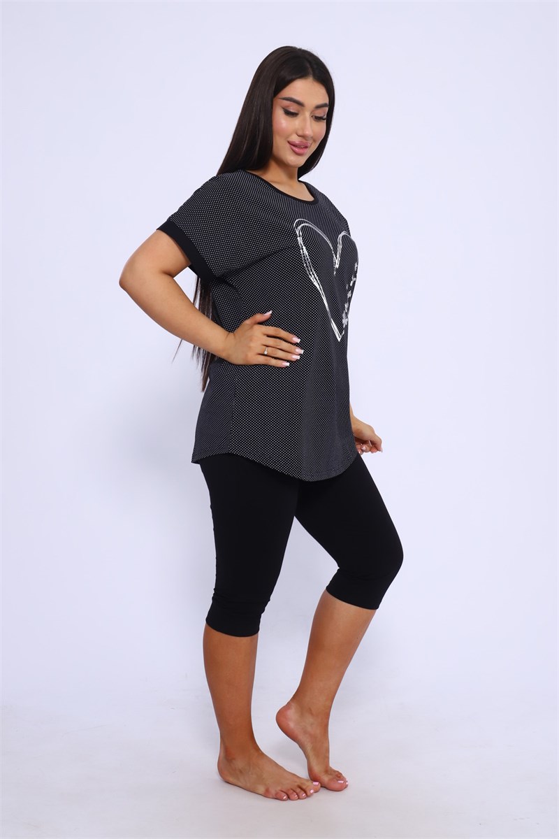 Костюм включает в себя стильную футболку и бриджи, выполненные из высококачественного материала, который гарантирует отличную воздухопроницаемость и приятные тактильные ощущения. Будьте уверены, что в этом комплекте вам будет удобно и тепло в любое время года. Он отлично сидит на фигуре и подчеркивает её достоинства, что особенно актуально для подходящей одежды больших размеров. Пижама с бриджами обеспечивает свободу движений, позволяя вам заниматься йогой, фитнесом или просто расслабляться на диване. Спортивный стиль костюма в сочетании с модными элементами поможет вам выглядеть стильно и современно даже в домашней обстановке. Футболка имеет удобный крой и не стесняет движений, что делает её отличным выбором для активного отдыха.