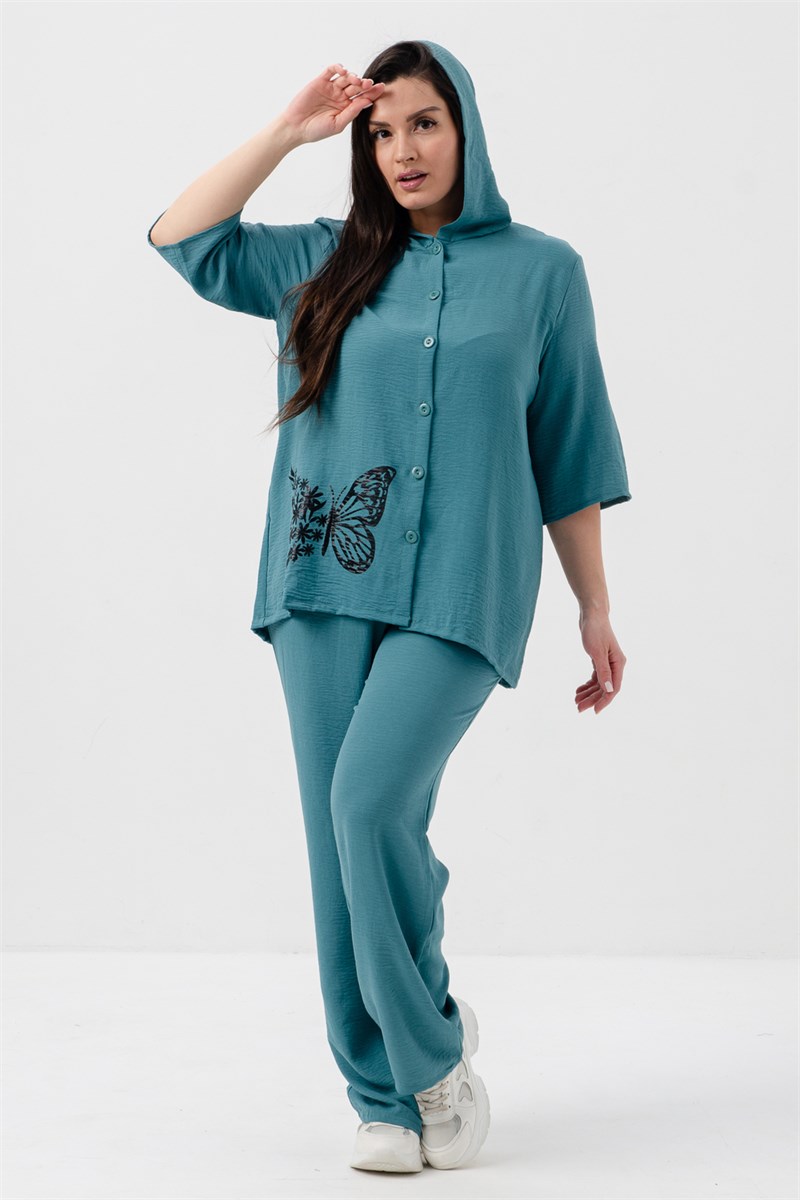 Костюм представлен в двух цветах - бирюзовом и темно синем, что позволяет выбрать наиболее подходящий вариант. Такая одежда подойдет для повседневной жизни, прогулок и встреч с друзьями. Она сочетает в себе стиль, комфорт и практичность, что делает ее отличным выбором для любого гардероба.
