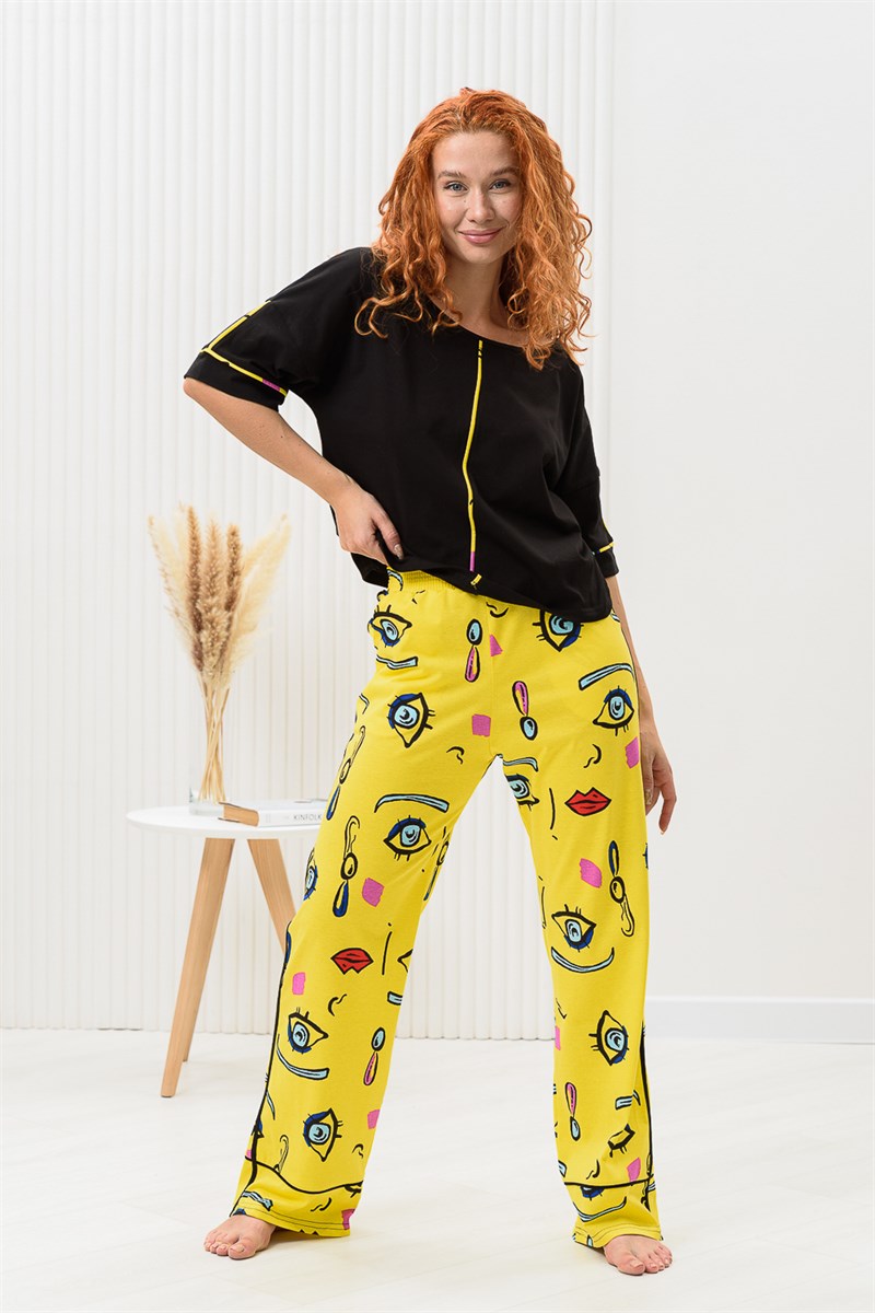 Костюм состоит из туники и брюк. Туника с округлой горловиной, свободная. Рукав короткий, с манжетом. Горловина обработана бейкой из основного полотна. Брюки прямые, на поясе, с боковыми карманами, с отделочным лампасом вдоль боковых швов.