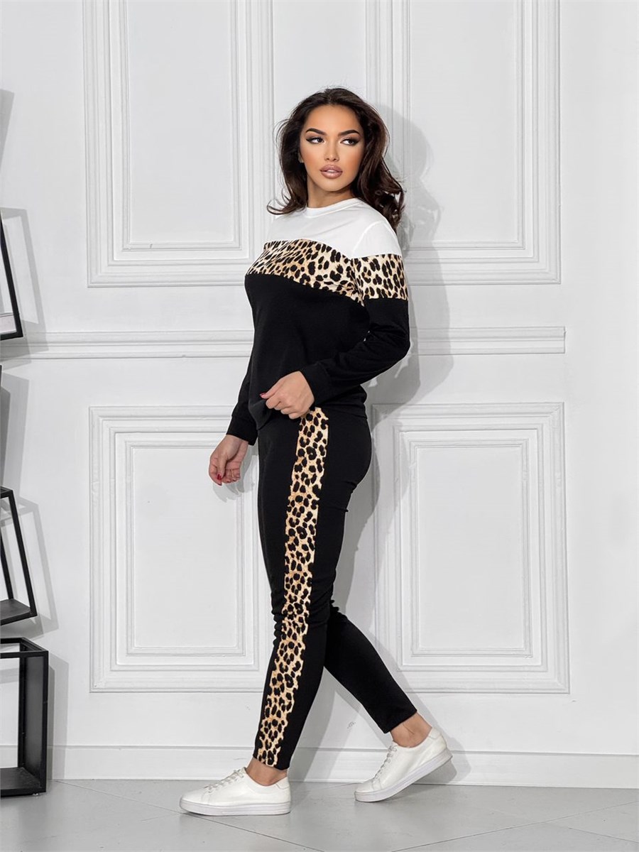 Представляем вашему вниманию новый женский костюм-лапша. Двойка состоит из кофты с длинным рукавом и зауженных штанов на резинке. Сочетание черного цвета и принта леопард создает красивый и эстетичный вид, который идеально подходит для осенне весеннего и летнего периода. Брючный костюм лапша женский из тонкого дышащего трикотажа. Не мнется и не вытягивается, прост в уходе, поэтому Вы всегда будете выглядеть женственно и элегантно! Отсутствие застежек делает этот комплект идеальным решением для беременных женщин - будущим мамам. Красивый костюм в рубчик с зауженными штанами базовый повседневный элемент. Свободный, с небольшим эффектом оверсайз, костюм лапша подойдет для дома и офиса, работы, учебы и поездок.