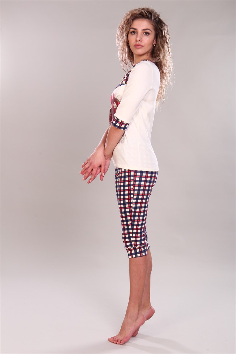 Элегантный женский комплект. Верх футболка с рукавами 3/4, украшенная модными клетчатыми вставками. Бриджи с классическим клетчатым узором гармонируют с декоративными элементами футболки. Модель выполнена из премиального интерлока. Идеально подходит для уютных вечеров и комфортного сна.