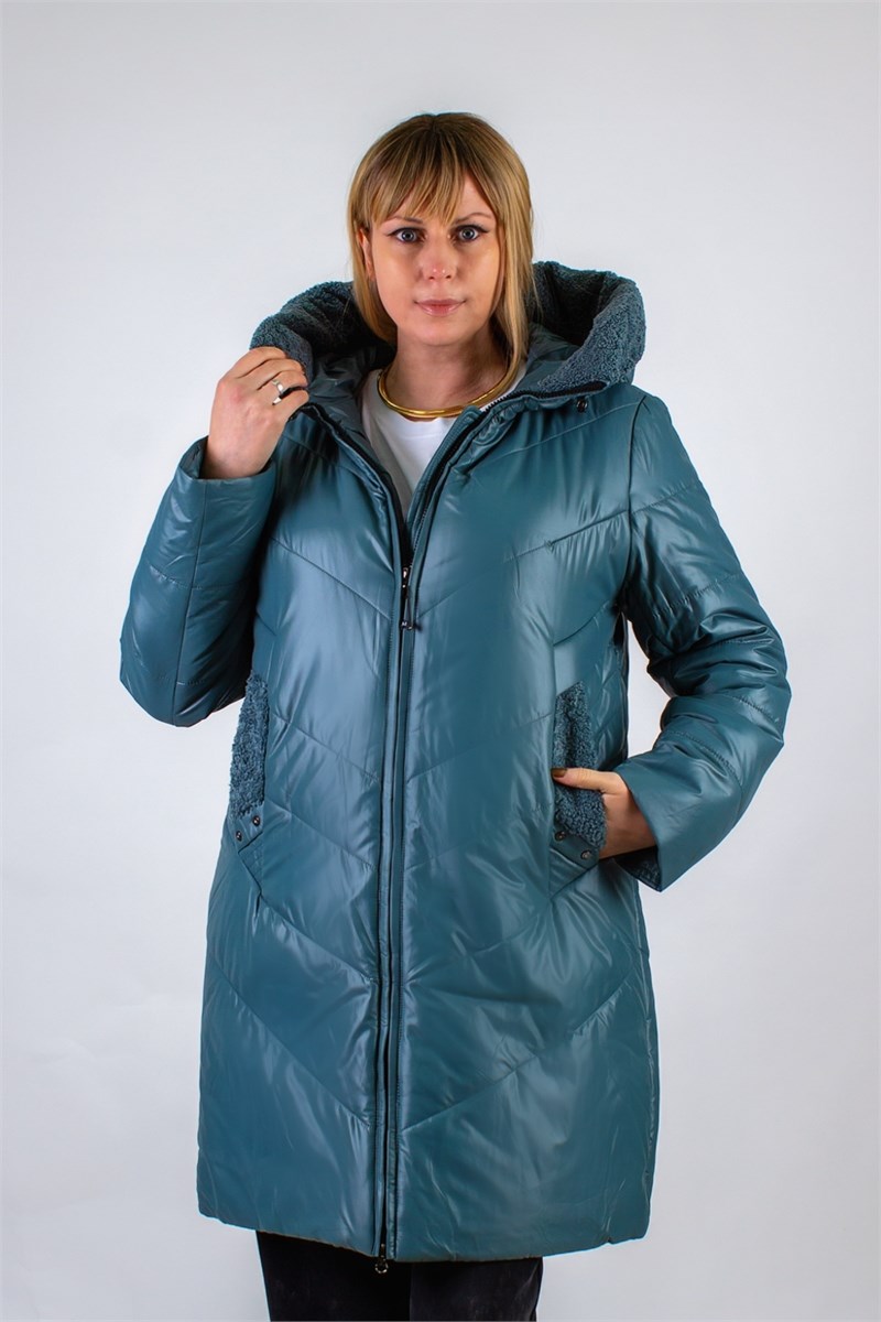 Объёмный капюшон с воротником-стойкой на фиксаторах комфортно регулируется по объёму и защищает не только голову, но и шею от сильного ветра. Эстетичную отделку составляют в тон изделию декоративные карманы и опушка капюшона из мелкого искусственного барашка лёгкая, гипоаллергенная и практичная альтернатива натуральному меху.