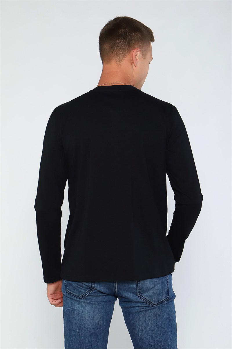Лонгслив мужской с округлой горловиной, обработанной усилителем. Широкая футболка с длинными рукавами имеет свободный крой и классическую, не спущенную линию плеча.