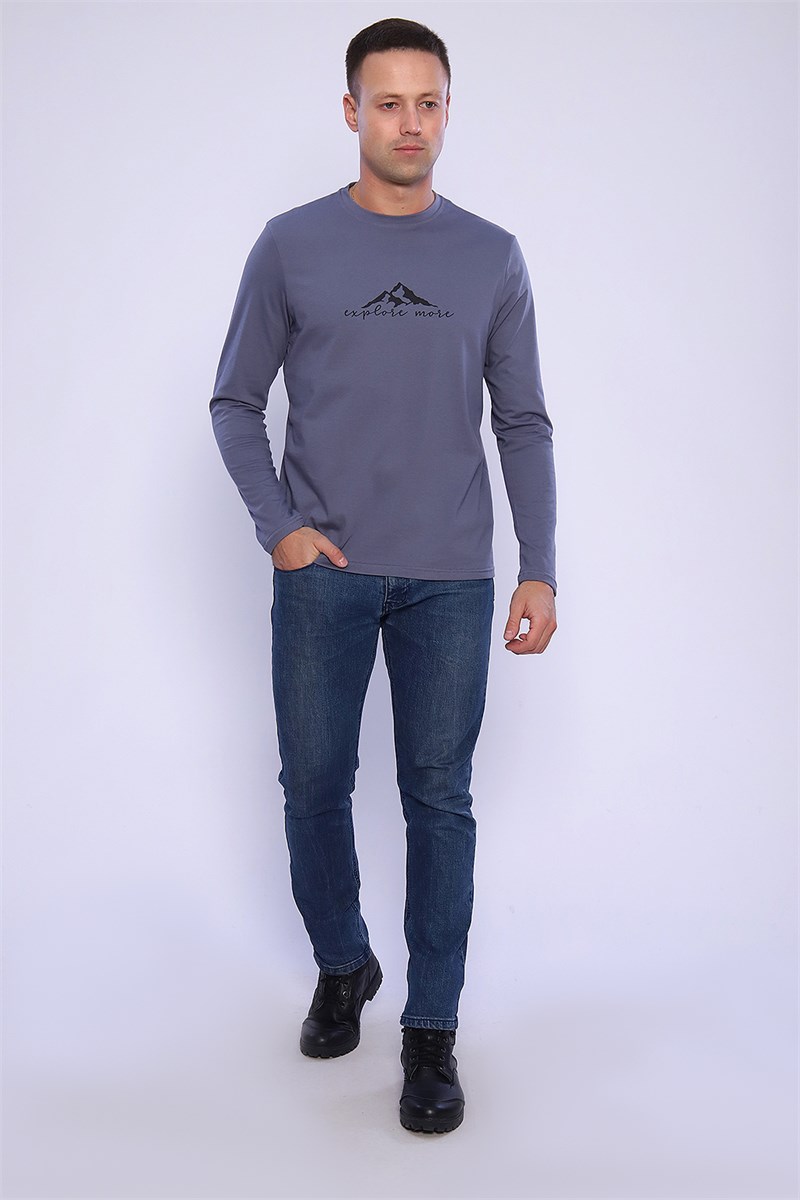 Мужская футболка с длинным рукавом, округлой горловиной обработанной усилителем, на полочке принт . Лонгслив имеет свободный покрой и классическую, не спущенную линию плеча.