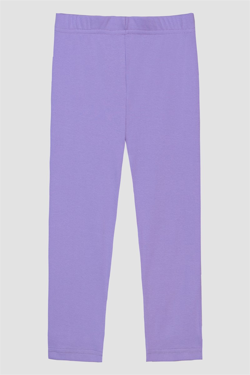 Лосины для девочки прилегающего силуэта. Пояс цельнокроенный, с эластичной тесьмой внутри, закрепленной в шов. Низ лосин обработан швом вподгибку.