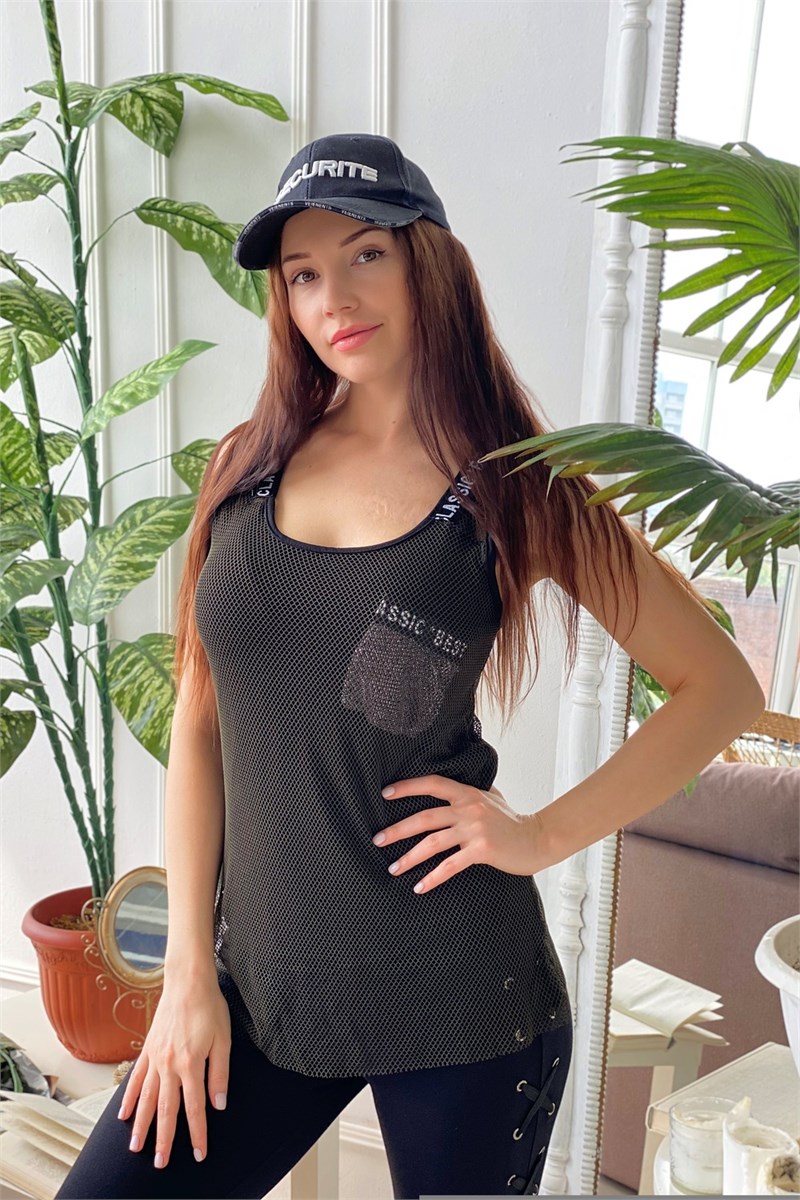 Майка трапециевидного силуэта, средней длины, с округлой горловиной спереди и V-образной на спинке, двухслойная. Верхний слой майки выполнен из сетки. Нижний слой майки выполнен из вискозы. Бретели, по горловине, обработаны декоративной тесьмой. На полочке расположен фигурный карман из отделочного полотна. Горловина и проймы обработаны бейкой из основного полотна.