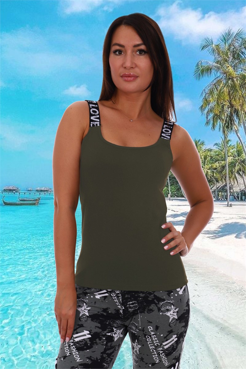 Майка прилегающего силуэта, средней длины, с округлой горловиной. Бретели выполнены из эластичной тесьмы с надписями. Горловина и проймы обработаны бейкой из основного полотна.