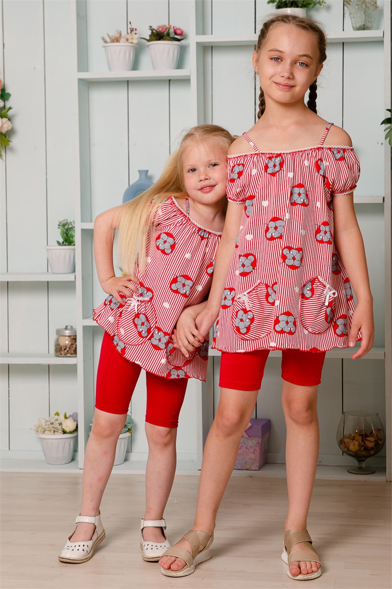 Майка детская летняя. Свободного А-силуэта на тонких бретелях. С двумя декоративными кармашками, на которых настрочены бантики из атласной ленты. Горловина и рукава собраны на кружевную резинку. Все срезы в изделии обработаны декоративной краеобметочной строчкой.