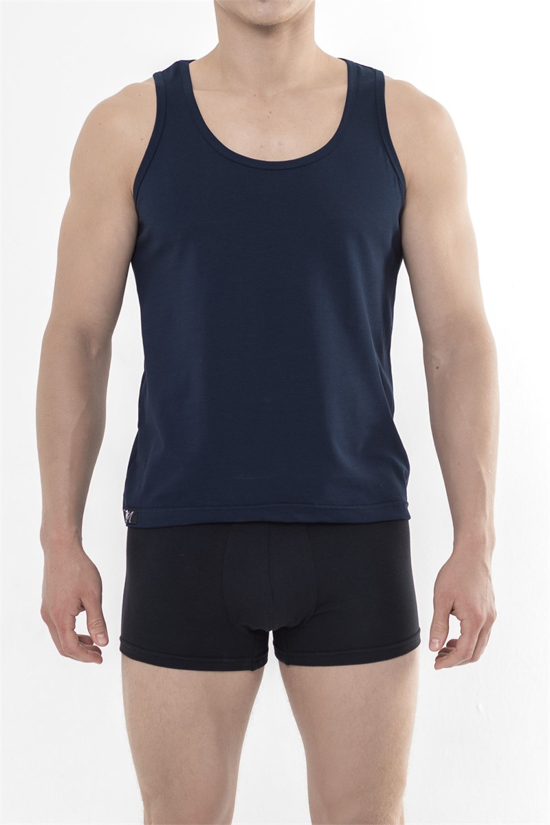 Майка мужская изготовлена из мягкого хлопкового трикотажа качества пенье. Майка однотонная полуприлегающего силуэта, длиной до середины линии бедер, с углубленным вырезом горловины и пройм, полочка и спинка майки прямые цельнокроеные.