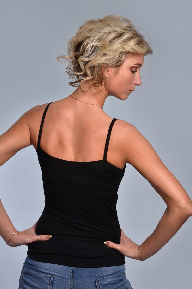 Базовый топ на тонких бретелях, прямого покроя с округлым вырезом горловины. Топ изготовлен из высококачественной вискозы с добавлением эластана, что обеспечивает облегающий покрой и удобство носки, обеспечивая идеальный силуэт.