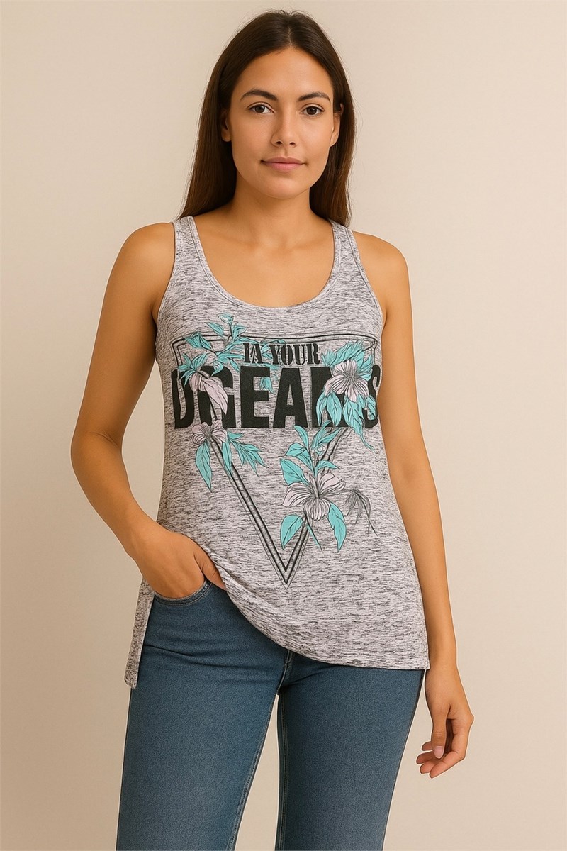 Женская майка с необычным подчеркивающим принтом. Модель выполнена из кулирного волокна с лайкрой.
