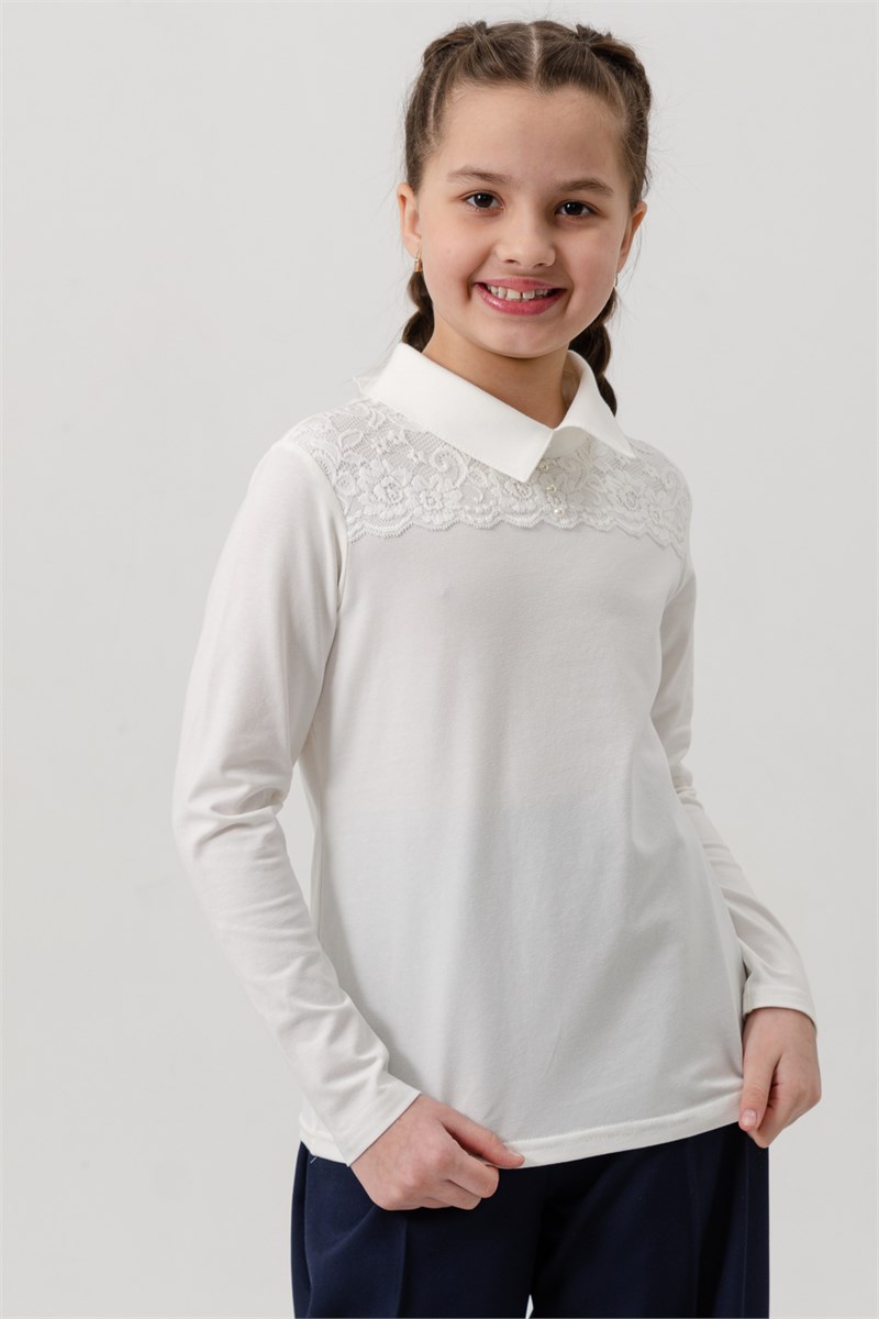 Блузка для девочек младшего и старшего школьного возраста, из однотонного трикотажного полотна кулирка с лайкрой. Блузка полуприлегающего силуэта, с втачным рукавом, с застежкой на одну пуговицу и петлю, с сорочечным воротником со стойкой. На деталь переда из кулирки с лайкрой настрочена кружевная кокетка. На детали спинки разрез под застежку. Рукав длинный одношовный. Воротник сорочечный с отрезной стойкой. По отлету и концам воротника, по шву притачивания стойки в горловину и шву стачивания стойки с воротником проложена отделочная строчка. На кокетку переда по центру приклеены 4 бусины. Низа рукавов и изделия подогнуты.