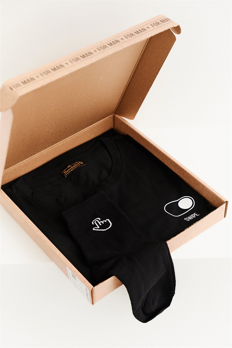 Подарочный набор СВАЙП. Черная мужская футболка с принтом и носки с принтом подчеркнут вкус и чувство юмора. Подарочный набор упакован в крафтовую коробку с тематическим принтом. Футболка из 100% хлопка подойдет для повседневной носки и для выхода из дома. Мужская футболка подойдет для занятий спортом и для активных прогулок. Футболка будет отлично сидеть практически на любой фигуре. Носки подойдут к любой одежде и обуви. Изготовлены из высококачественного хлопка, который отлично впитывает влагу, пропускает воздух и подходит даже для самой чувствительной кожи. Хорошо сохраняют форму и цвет, устойчивы к истиранию. Подарочный набор СВАЙП будет отличным подарком второй половинке, близкому другу, отцу и дедушке.  Размер носков 40-47.