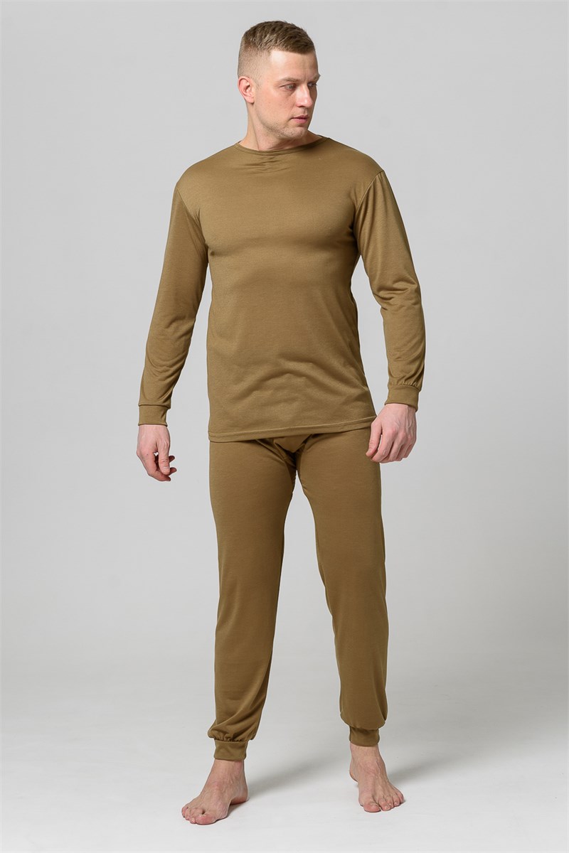 Комплект состоит из фуфайки и кальсон. Фуфайка прямого силуэта. Рукава втачные одношовные с притачными манжетами. Вырез горловины округлой формы, окантован бейкой. Кальсоны без боковых швов с двойным гульфиком, двойной ластовицей и одинарной вставкой сзади. По низу кальсон манжеты. Вырез гульфика окантован бейкой. По верху кальсон проложена эластичная лента