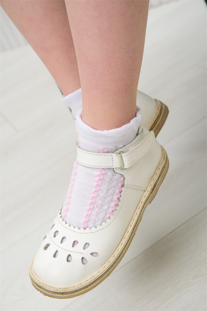Летние носочки для девочки. Верх носочка выполнен рюшей, стопа узором. На передней части носка узор и косички контрастной пряжей.